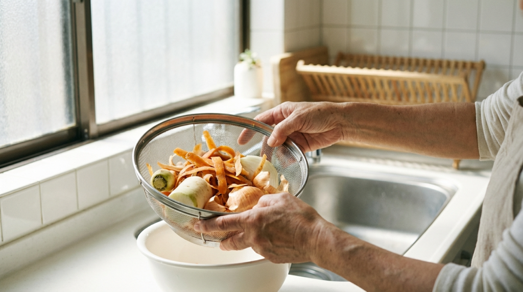 - 野菜くずやお茶ガラは、ここに入れて水分を切る