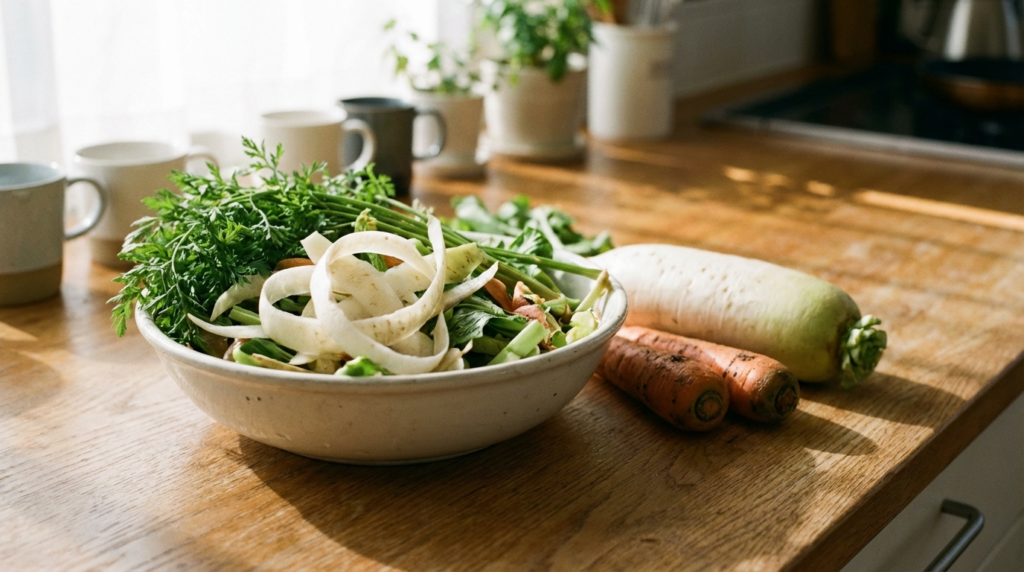 - 野菜の皮や芯を、ゴミ箱ではなくボウルやコンポストへ