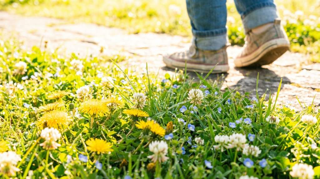 春の風が気持ちいい日に、いつもより5分だけゆっくり歩いてみる。道端のたんぽぽに「きれいだね」とつぶやいてみる。