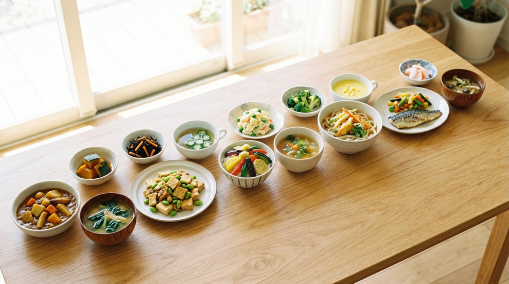 メイン・副菜・汁物の3品をセットで、すべて15分以内に完成するレシピだけで構成しました。週末に冷凍野菜を買っておけば、平日はもう「今日どうしよう」と悩まなくて大丈夫です。