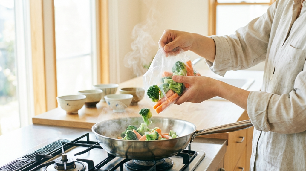 この3つのルールは、冷凍野菜をおいしく使うための基本原則です。詳しく知りたい方は「野菜高騰でも食費を抑える。冷凍野菜『5つのメリット』と使いこなしのコツ」の記事もあわせてどうぞ。