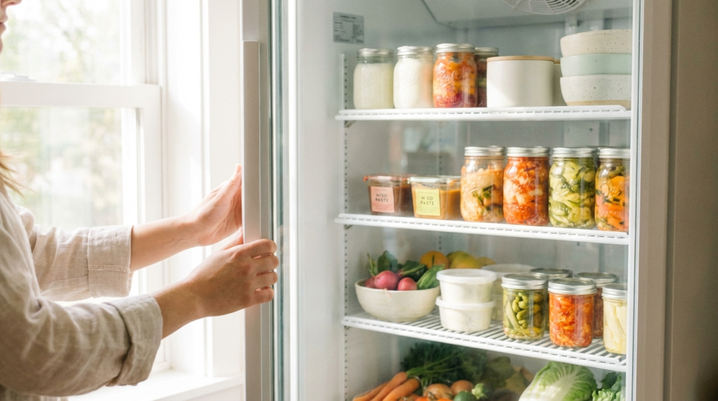 冷蔵庫の中の同じ場所に、いつも同じ発酵食品を置いておく。「考える」を省くだけで、腸活は驚くほどラクになります。